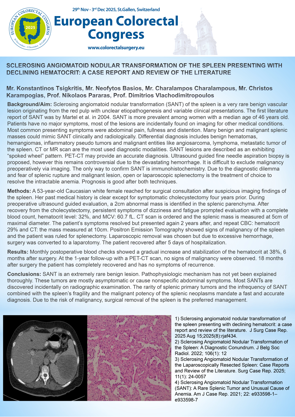 European Colorectal Congress 2025 – Παρουσίαση poster με θέμα: Sclerosing Angiomatoid Nodular Transformation of the Spleen presenting with declining hematocrit: A case report and review of the literature