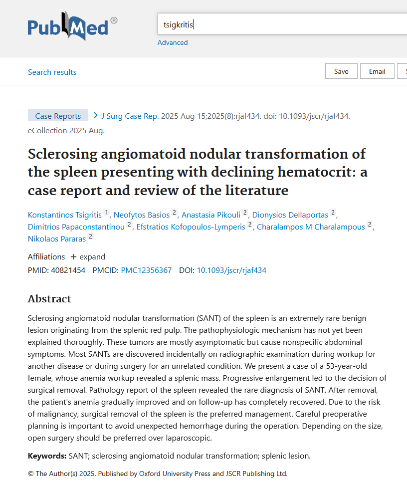 Η εργασία ”Sclerosing angiomatoid nodular transformation of the spleen presenting with declining hematocrit: a case report and review of the literature”, δημοσιεύτηκε στο Journal of Surgical Case Reports. Περιγράφει μία εξαιρετικά σπάνια καλοήθη αγγειακή βλάβη του σπληνός. Παρουσιάστηκε σε ελληνικά και διεθνή συνέδρια – forum: