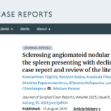 Η εργασία παρουσιάστηκε στο 34ο Πανελλήνιο συνέδριο Χειρουργικής που έλαβε χώρα στην Αθήνα στις 19-23 Νοεμβρίου 2025. Σκοπός της εργασίας είναι η παρουσίαση ενός εξαιρετικά σπάνιου περιστατικού και η ανασκόπηση της βιβλιογραφίας για τη Σκληρυντική Αγγειοματώδη Οζώδη Μετατροπή του Σπληνός. Πρόκειται για σπάνια καλοήθη αγγειακή βλάβη αβέβαιης αιτιολογίας που προέρχεται από τον κόκκινο πολφό. Η παθογένεση δεν είναι ακόμη σαφής. Για πρώτη φορά περιγράφηκε από τους Martel et al. το 2004. Προσβάλλει κυρίως γυναίκες 30 έως 60 ετών. Κλινικά είναι ασυμπτωματική πάθηση ή προκαλεί κόπωση, άτυπα κοιλιακά άλγη και διάταση κοιλίας. Ανακαλύπτεται τυχαία σε απεικονιστικές εξετάσεις χωρίς παθογνωμονικά χαρακτηριστικά, στην αξονική τομογραφία αναγνωρίζεται ως μία μεγάλη μονήρης υπόπυκνη μάζα. Στη μαγνητική τομογραφία περιγράφεται ως “spoke-wheel pattern”, που αντιστοιχεί σε ένα κεντρικό ακτινικό ινώδες στρώμα με ινώδη διαφράγματα που διαχωρίζουν αγγειωματώδη οζίδια. Η διαγνωστική προσέγγιση με παρακέντηση δια λεπτής βελόνης (FNA) ενέχει κίνδυνο αυτόματης ρήξης μεγάλων αγγείων και πιθανότητα εξάπλωσης κακοήθειας. Λόγω του μεγέθους του προσομοιάζει με πρωτοπαθή κακοήθεια σπληνός ή μεταστατική νόσο. Διαφορική διάγνωση από αιμαγγείωμα σπληνός, λέμφωμα, αγγειοσάρκωμα, μεταστάσεις από μελάνωμα και κακοήθεις όγκους πνεύμονα και μαστού. H διάγνωση τίθεται με ιστοπαθολογική εξέταση μετά από σπληνεκτομή. Αναδεικνύονται πολυάριθμοι αγγειακοί όζοι που διαχωρίζονται με ινοσκληρυντικό στρώμα από αιμοσιδηρινοφάγα, πλασματοκύτταρα, ιστιοκύτταρα και λεμφοκύτταρα. Διαγιγνώσκεται δύσκολα λόγω άτυπων κλινικών και απεικονιστικών χαρακτηριστικών, απαιτεί σπληνεκτομή και ιστολογική επιβεβαίωση. Δεν απαιτείται συμπληρωματική μετεγχειρητική θεραπεία κι έχει πολύ καλή πρόγνωση.